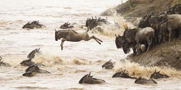 Young male jumps over the Mara River to tomorrow. Photo: Paul Banton